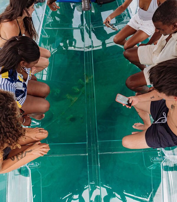 A transparent boat experience allowing guests to see directly into the ocean below.